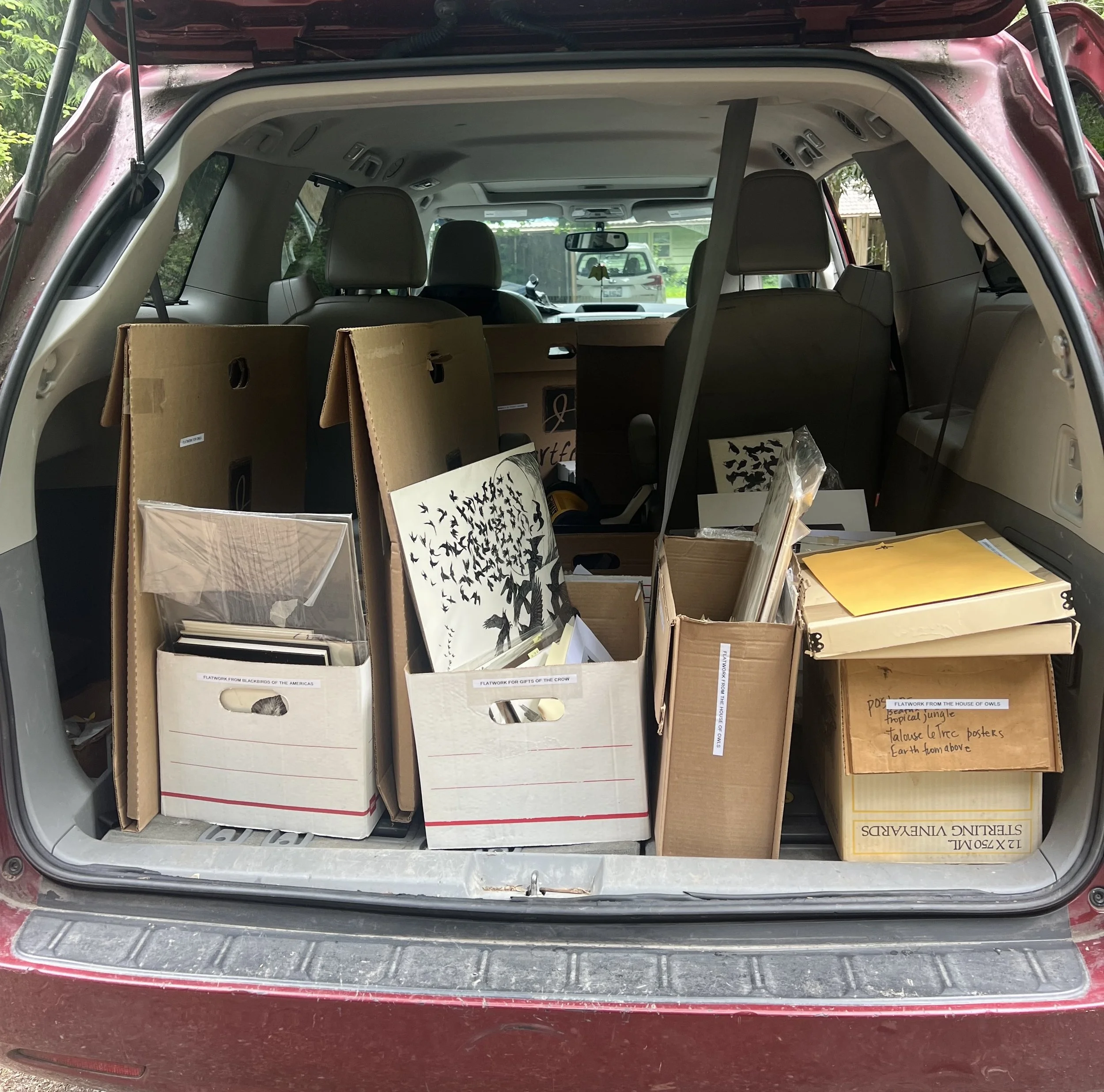 After 4 months of 10-15 hours a week of work, the artist was ready to deliver a batch of boxes to the University. I loaded 17 boxes into my van and drove them to the archive.