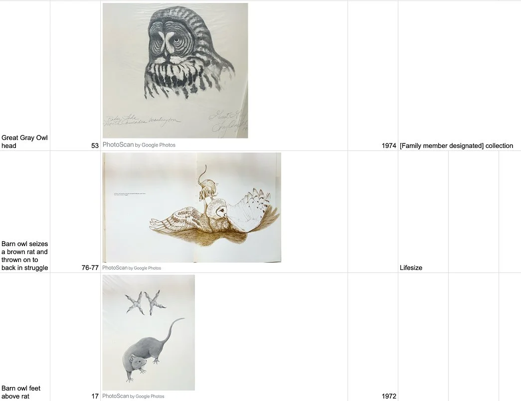 2. To create a sharable digital catalogue, I photographed, relabeled, and catalogued each work into book-specific spreadsheets. A low-resolution scan of each work was adequate for our purposes. The family used the spreadsheet to share among the heirs so they could indicate their preferences, and those specific pieces were not included in the final donation to the University.